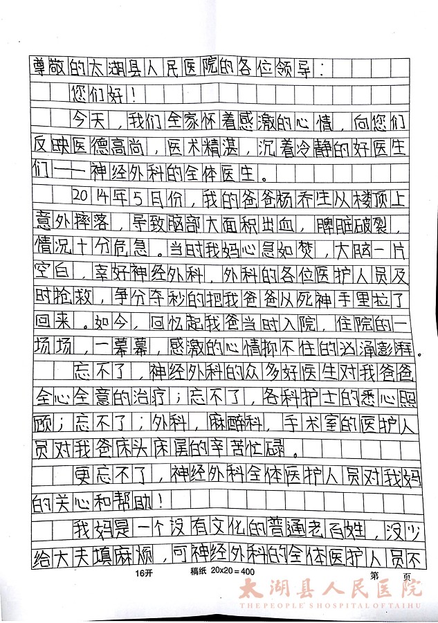 来到县医院办公室,女人向工作人员迫切而激动地叙述了事情的经过:今年5月的一天,徐桥镇村民杨乔生在给一建筑工地打工时,不慎从楼顶意外摔落,患者很快进入重度昏迷状态,生命危在旦夕,情况十分危急。县医院接到通知后,立即组织相关科室医护人员成立急救队伍,等候在医院。当“120”救护车抵达医院时,患者得到了第一时间的会诊和救治。经诊断,患者系颅内大面积出血,重度昏迷;脾破裂,大出血休克等,而这任何一个诊断都可能是致命的损伤。县医院医护人员不放弃不抛弃,经过县医院两次开颅手术和一次腹部手术,长达半个多月的救治,硬是把患者一次次从死亡线上夺了回来。