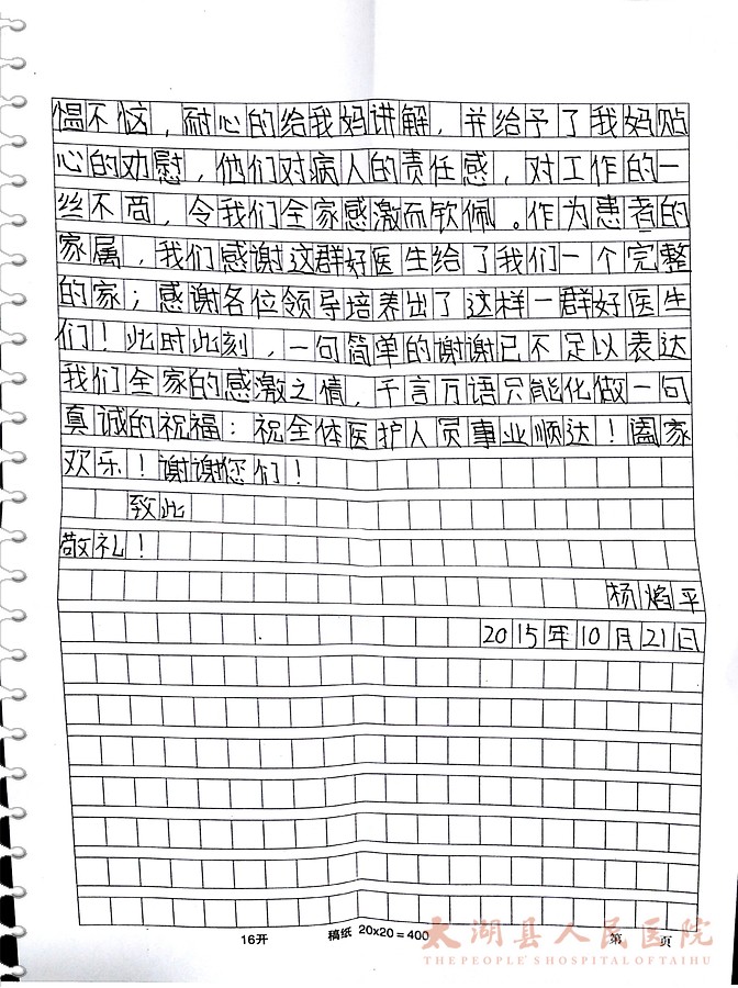 事情过去几个月了,小马说起当时的情形仍激动不已,感激之情溢于言表,并几度落泪。她说她没读什么书,不会写字,短短的一封感谢信还是刚上初一的儿子写的,她说为了这封感谢信,她特地嘱咐儿子要练好字,就这样不能完全表达他们全家的感激之情。她说儿子的那句“感谢这群好医生给了我们一个完整的家”无数次令她动容,此刻,在医院办公室说起这句话她仍然潸然泪下。