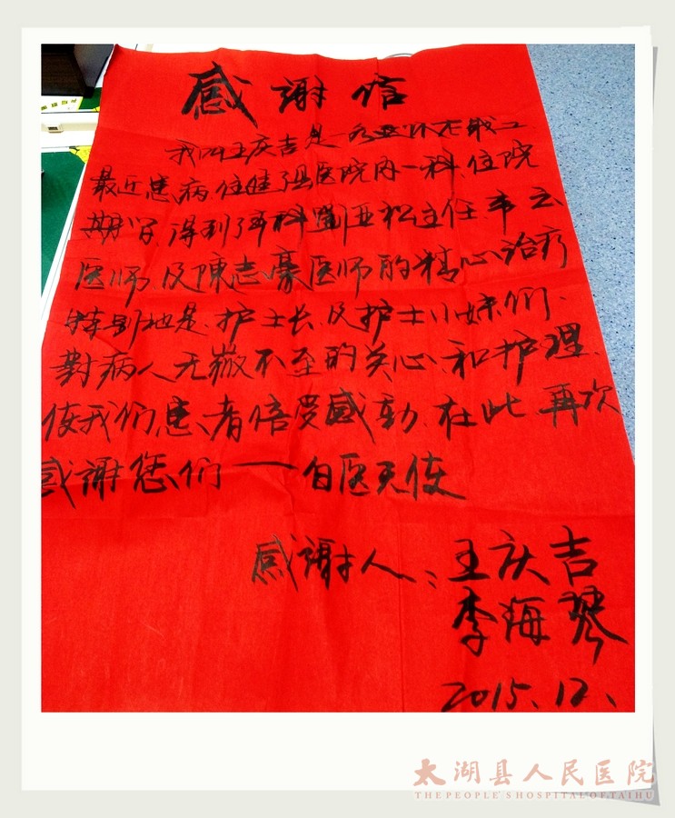 12月16日,王大爷给县医院内一科医护人员送上了一封大红感谢信,对刘亚松、韦云、陈志豪等医师的精心治疗,全体护士无微不至的关心和照顾表示衷心的感谢。