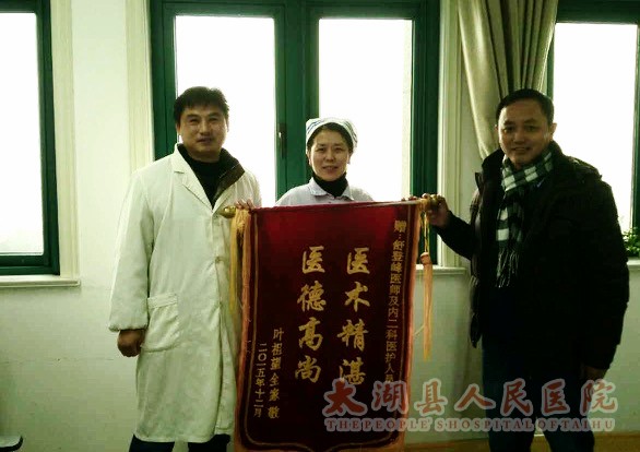 经过半个多月的治疗和护理,叶老终于可以出院了。叶老的儿子远在上海,因工作繁忙,无法抽身,特别委托叶老的女婿送来了一面锦旗:“医术精湛,医德高尚”,以此感谢叶老住院期间内二科医护们的悉心诊治。(孙文东)