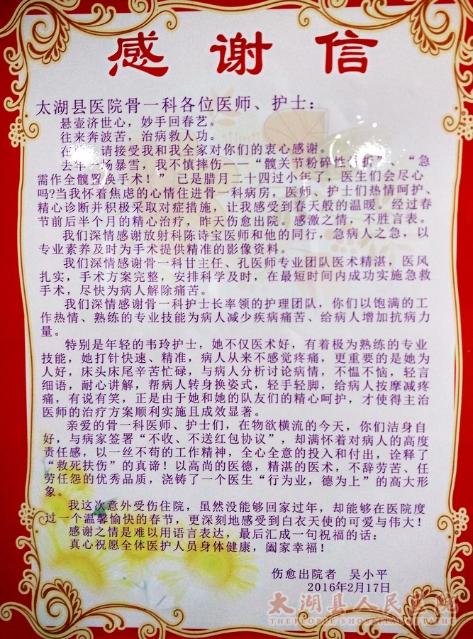 匆匆的,春节即将结束,骨一科的医护工作人员一直坚守岗位,他们没有春节假期,辛苦并快乐着,因为他们迎来了最暖心的新年礼物—一封伤愈出院患者的感谢信。