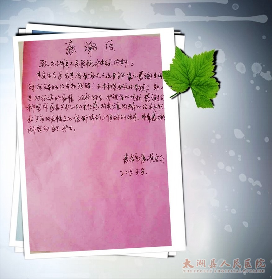 3月8号上午,正当大家还在忙忙碌碌的时候,一位家属把一封感谢信送到神经内科护士长汪昕鑫手中,以此感谢神经内科全体医护人员对她父亲的精心治疗和细心照顾。