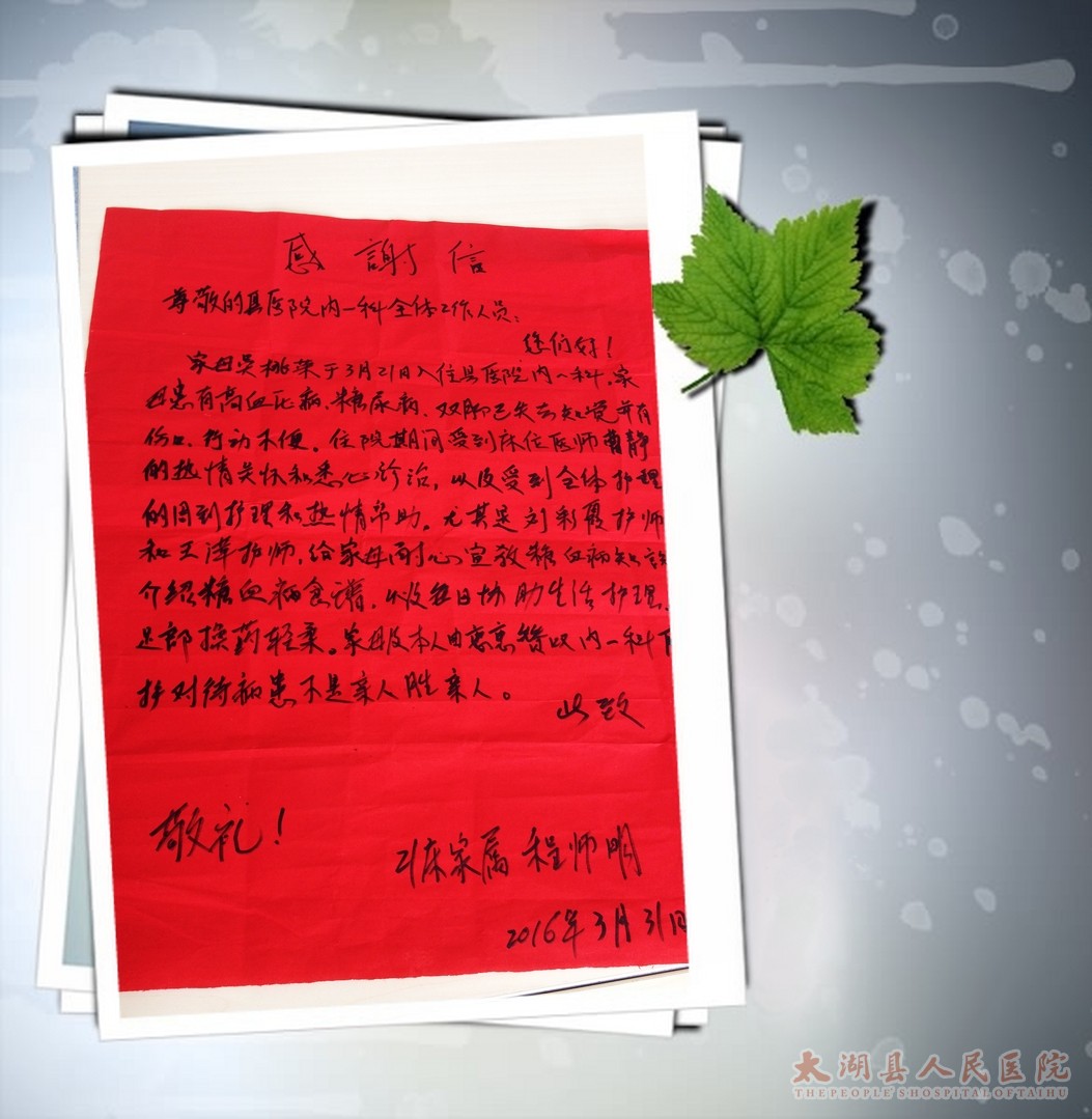 “尊敬的内一科全体工作人员:你们好,家母于3月21日入住县医院内一科,住院期间,受到床位医生曹静的热情关怀和悉心诊治,以及受到全体护理人员的周到护理和热情帮助,家母及本人由衷赞叹内一科医护对待病患不是亲人胜亲人……”