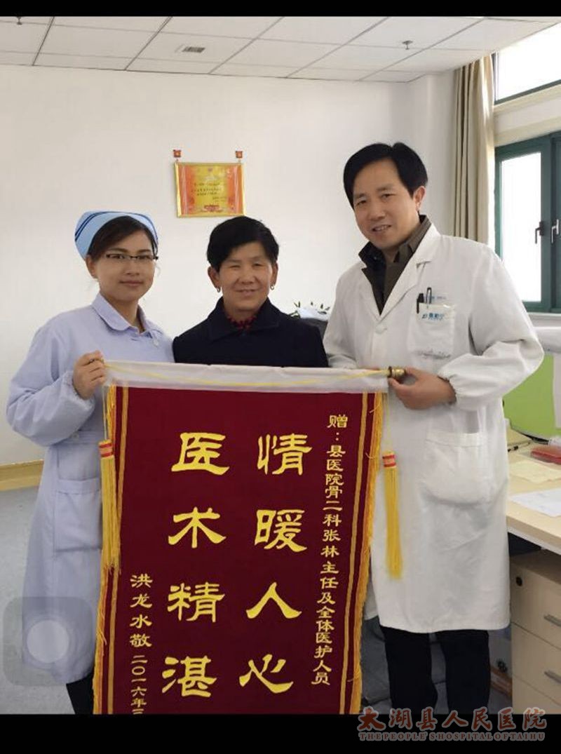 洪大爷今年已有73岁高龄,因“右膝关节疼痛,活动受限,伴右下肢跛行数年”来到县医院就诊,住进了骨二科。入院后医护人员经过讨论准备,为他制定了一整套完整的治疗方案。经过认真仔细的诊治,洪大爷右膝人工关节置换术手术顺利完成,术后右膝疼痛症状明显好转,患肢功能正在恢复之中,家属倍感欣慰,全家对张林副主任及所有医护人员精湛的技术、良好的服务态度、高度的责任心和视病人如亲人的高尚医德万分感激。为此,一家人专门赶制了一面锦旗送到骨二科以示感谢。(唐振江)