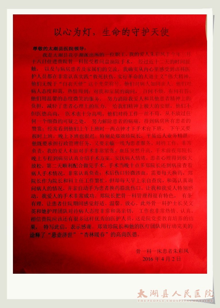 这是出院不久的朱阿姨一家对骨一科的肯定。记得朱阿姨术前那个紧张的,整夜都睡不着觉,细心的医护人员就一遍遍的做朱阿姨的心理工作,特别是副院长郑效珍,亲自去病房讲解手术过程,引导并安抚患者,解除她的紧张情绪;术后也是坚持每天亲自给朱阿姨换药,有时就算再忙,等到夜里都会亲自来病房换药,检查伤口愈合情况。如今朱阿姨已经康复出院了,今天特意送来了一封感谢信,表达她对骨一科医护人员的感激之情。