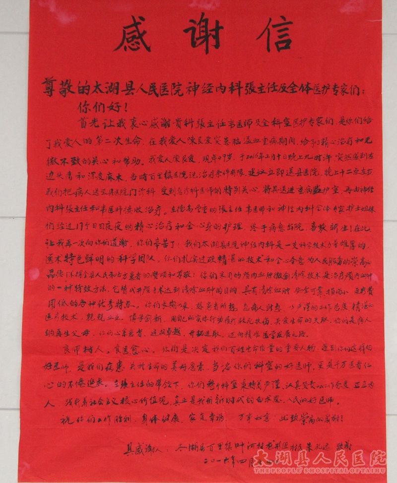 事情经过是这样的,3月23日陈艮爱女士因剧烈头痛伴左侧肢体瘫痪被诊断为脑出血、高血压病3级,入住县医院神经内科。患者病情危重,接诊医生韦炜迅速制定详细的诊疗方案,严密监测病情,及时用药;护理姐妹们不分日夜为患者监测病情,做好基础护理、生活护理,协助其翻身、擦洗、更换床单,协助患者家属做好患者的肢体康复锻炼等。经过大家的共同努力,陈女士的神志由昏迷逐渐转为清楚,病情逐渐稳定,由卧床不起到可以搀扶行走,并于4月9日康复出院。在患者出院回家休养期间,责任护士汪杨枝更是不忘患者,及时电话回访,询问其在家饮食,用药及恢复情况等,进一步康复指导,将护理服务延伸至家庭。为此,患者及家属非常感动,特地在4月20日复诊时送来一份锦旗和一封大红感谢信,以表示他们一家的感激之情!
