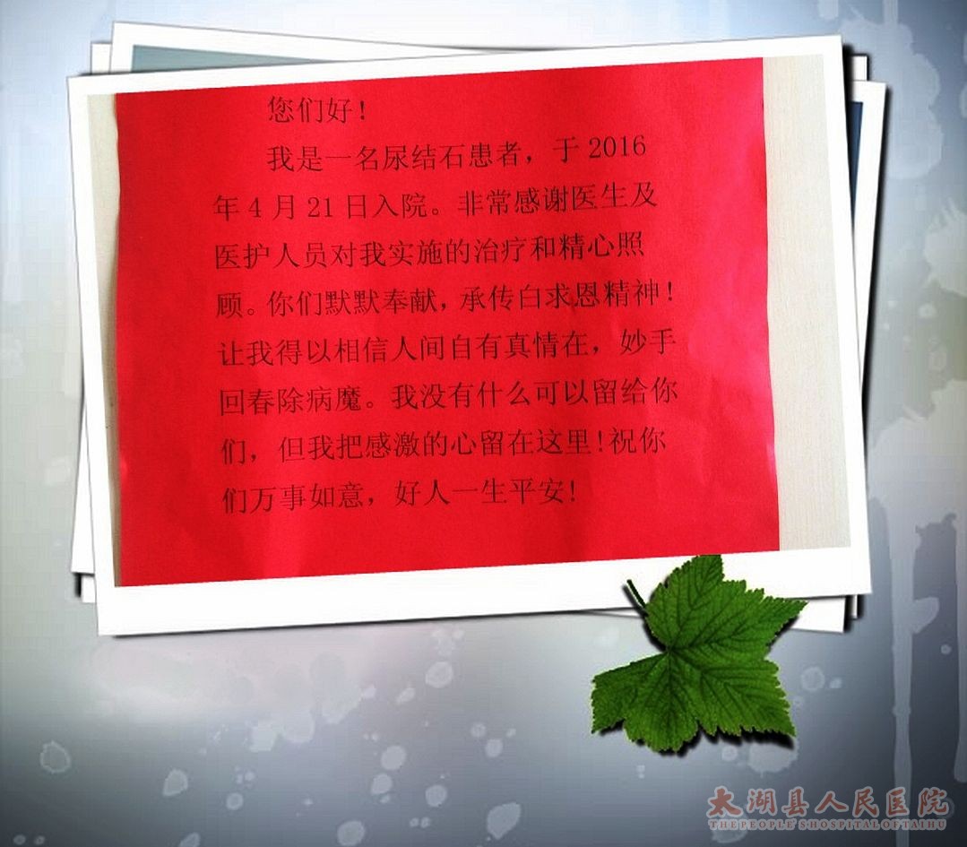 “我没有什么可以留给你们,但我把感激的心留在这里!”这是一位尿路结石患者写给县医院泌尿外科医护人员的感谢信。