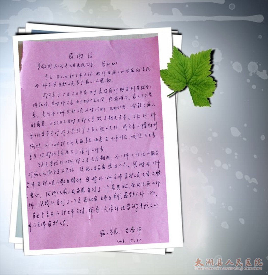 5.12这天泌尿外科24床王大爷家属捧着一封感谢信激动地来到泌尿外科护士站。