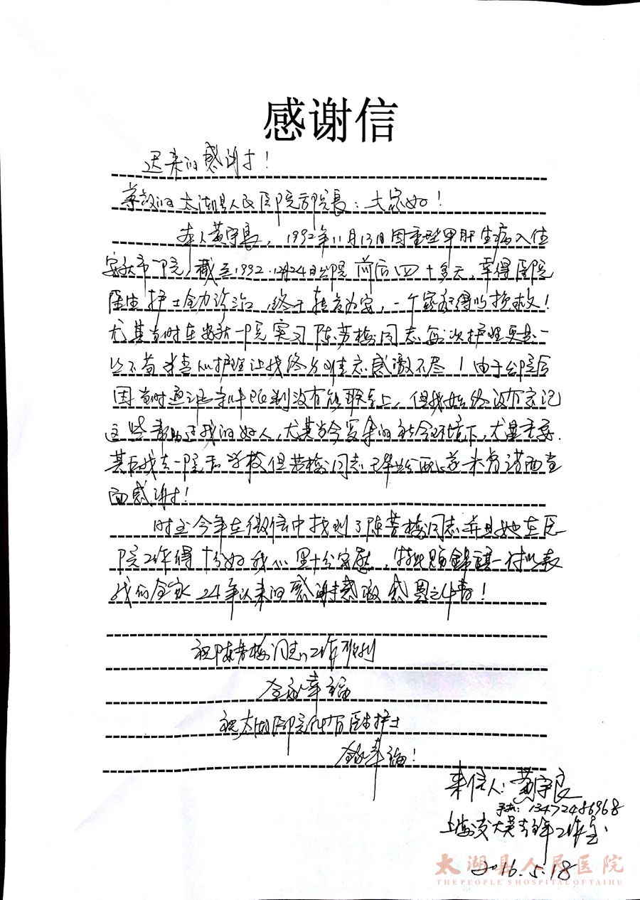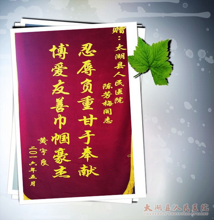 近日,院长方书法收到一封快递,拆开一看,却是一封感谢信。信中这样写道:本人黄宇良,1992年11月13日因重型甲肝入住安庆市一院,截止92年12月24日出院,前后四十多天,幸得一院医生护士全力诊治,终于转危为安,一个家庭得以挽救。尤其当时在安庆一院实习的陈芳梅同志,每次护理更是一丝不苟,精心的护理让我终身难忘,感激不尽!由于出院后当时通讯条件限制没有能联系上,但始终没有忘记这些帮助过我的好人,尤其当今复杂的社会环境下,尤显重要。其后我去一院和学校,但芳梅同志已毕业分配,遂未曾谋面当面感谢。时至今年在微信中找到了陈芳梅同志,并且得知她在医院工作得十分好,我心里十分安慰,特赠锦旗一副以表我们全家24年来的感谢感激感恩之情。