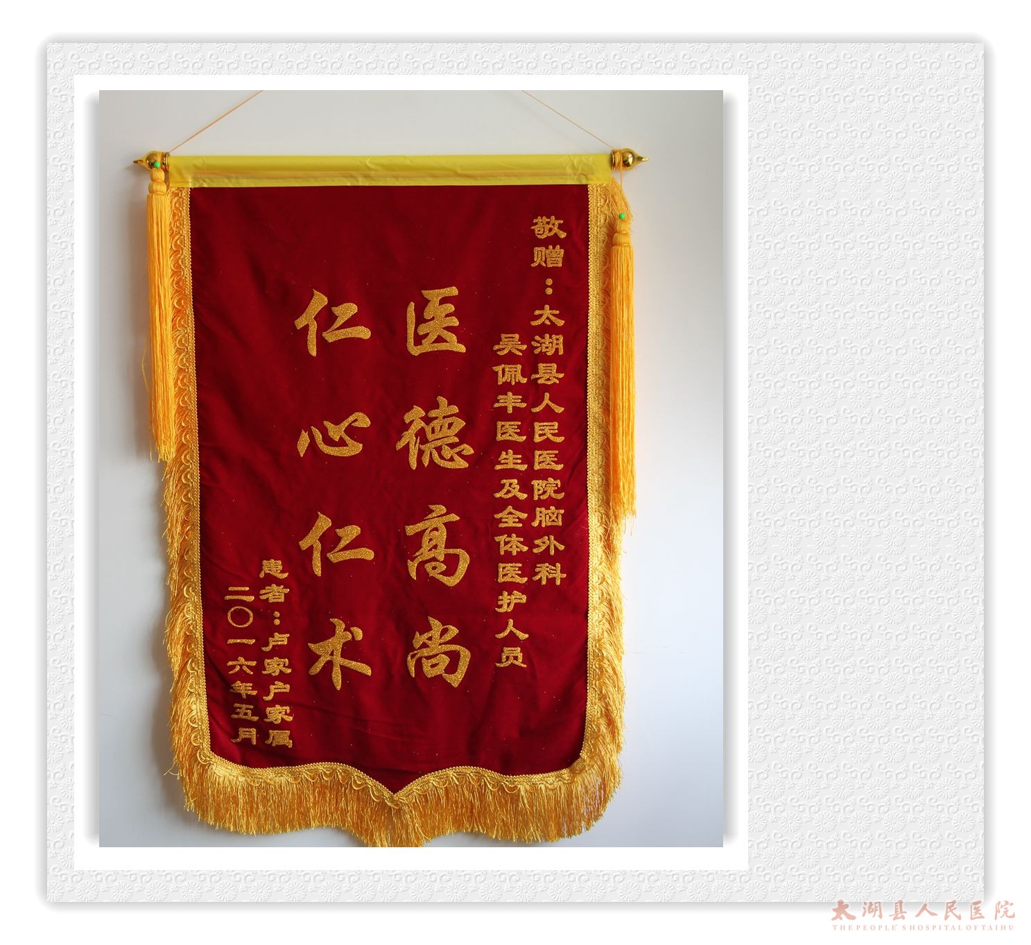 原来事情是这样的,患者卢大爷,3月2日因“突发左侧肢体无力1小时伴呕吐”收住神经外科吴佩丰医生床位,头颅CT提示右侧基底节脑出血。入院后4小时神志转差,呕吐频繁,急诊复查,出血量增加,并破入脑室。急诊开颅手术后送入重症医学科,术后第二日转回普通病房。患者在住院期间受到了吴佩丰医生及神经外科医护人员的悉心诊治,精心照顾,中途去合肥做高压氧治疗期间,吴佩丰医生还几次打电话询问、关心患者情况。现在患者言语思维清晰,左侧肢体功能障碍康复中。家属非常感动,出院后特地送上一面锦旗以表感激之情。