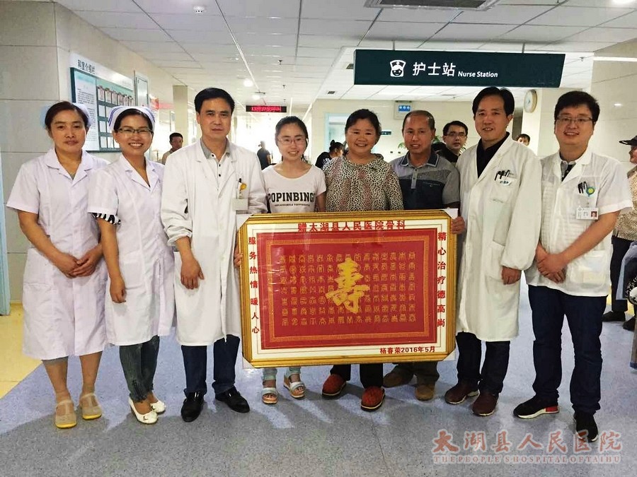 送来“百寿图”的是患者杨妈妈的女儿。杨妈妈不幸得了两侧股骨头都坏死,在家生活都不能自理,走路都是用双拐支撑。4月份在骨二科由方晓葆主任做了右侧股骨头置换术,恢复的非常好,家人感激万分之下,又多次找到方主任,要求把左侧股骨头置换术也做了。于是5月23日杨妈妈再次入院,5月26号成功手术。术后方主任每天早早的来到病房查房,责任护士细心观察生命体征及伤口等病情变化,耐心的跟家属交流术后一切注意事项,指导帮助康复功能锻炼。经全体医护人员的悉心照顾,精心医治,杨妈妈战胜了手术前后的病痛,顺利康复出院。住院期间,杨妈妈一家与骨二科医生和护士相处得十分融洽,互相关心理解,发展出了一段温馨和谐的医患关系。病愈出院后,为表达对骨二科医护人员的感谢,杨女士的女儿特地将亲手绣制的一幅百寿图送与骨二科。