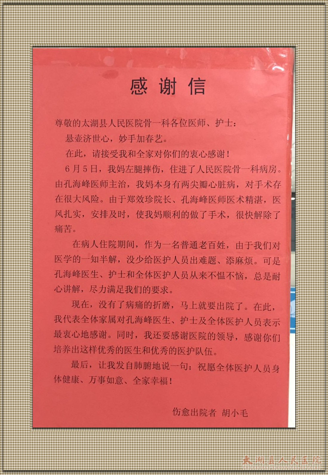这是出院不久的胡奶奶一家对骨一科的肯定。记得胡奶奶术前紧张的整夜都睡不着觉,细心的医护人员就一遍遍的做她的心理工作。特别是郑效珍副院长,亲自去病房讲解手术过程,正确引导并安抚患者,解除患者紧张情绪。术后胡奶奶因心脏不好住进了重症监护病房,吴文英护士长担心老人家紧张害怕会影响术后恢复,亲自到重症监护病房安慰她,陪老人家度过了危险期。郑效珍副院长也是坚持每天亲自给胡奶奶换药,有时就算再忙,等到夜里加班都会来病房换药,检查伤口愈合情况。如今胡奶奶已经康复出院了,今天特意送来了一封感谢信,表达她对骨一科医护人员的感激之情。