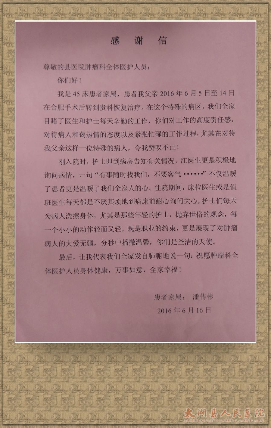 肿瘤科近日收到一位出院患者家属冒雨送来的感谢信。信纸虽轻,却饱含了在生死边缘徘徊的患者对全力救治自己的医护人员的感激之情。