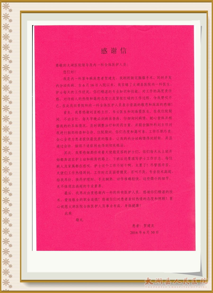 “我是内一科第9病房患者,我刚刚做完脑瘤手术,同时并发内分泌疾病,自6月16日入院以来,我目睹了太湖县医院内一科医生、护士每天的工作状况,你们精湛的专业知识和技能,对工作的高度责任感,对待病人的热情和蔼的态度以及紧张忙碌的工作过程,令我赞叹不已,再次我向贵院和内一科全体医护人员表示崇高的敬意和深深的感谢!”……