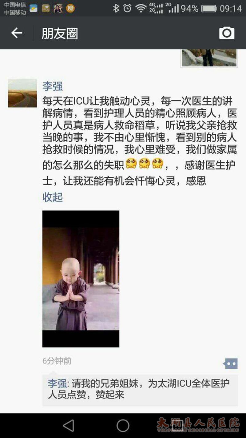 “每天在ICU(重症医学科)让我触动心灵。听说我父亲抢救当晚的事,我不由心里惭愧。感谢医生护士,让我还能有机会忏悔心灵,感恩。请我的兄弟姐妹,为太湖县医院ICU全体医护人员点赞……”
