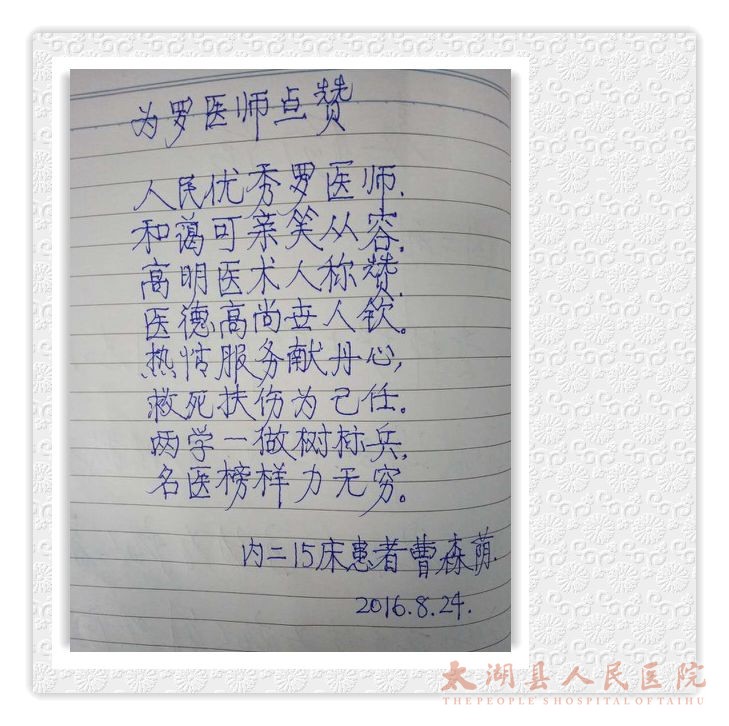 这是8月26日上午,退休教师曹先生在办理出院后,一遍又一遍的在内二科医办室和护办室表示感谢,并在意见簿上写下两首小诗表达对主治医师罗雪兵和各位护士的由衷赞美!