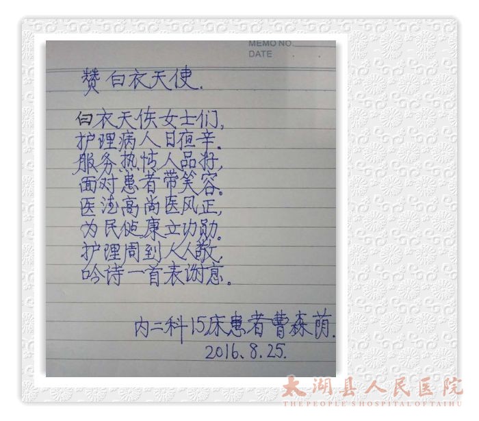 曹老师深情的说:“我患高血压及冠心病10余年,在多家医院都进行过检查和治疗,尤以这次在太湖县人民医院心内科住院感觉格外温暖,罗医生不厌其烦、技术精湛,护士长及各位护士小妹耐心、细心,语言温柔,专业水平高,让我在很短的时间内达到身体与心理的双重康复,谢谢你们!谢谢你们!”