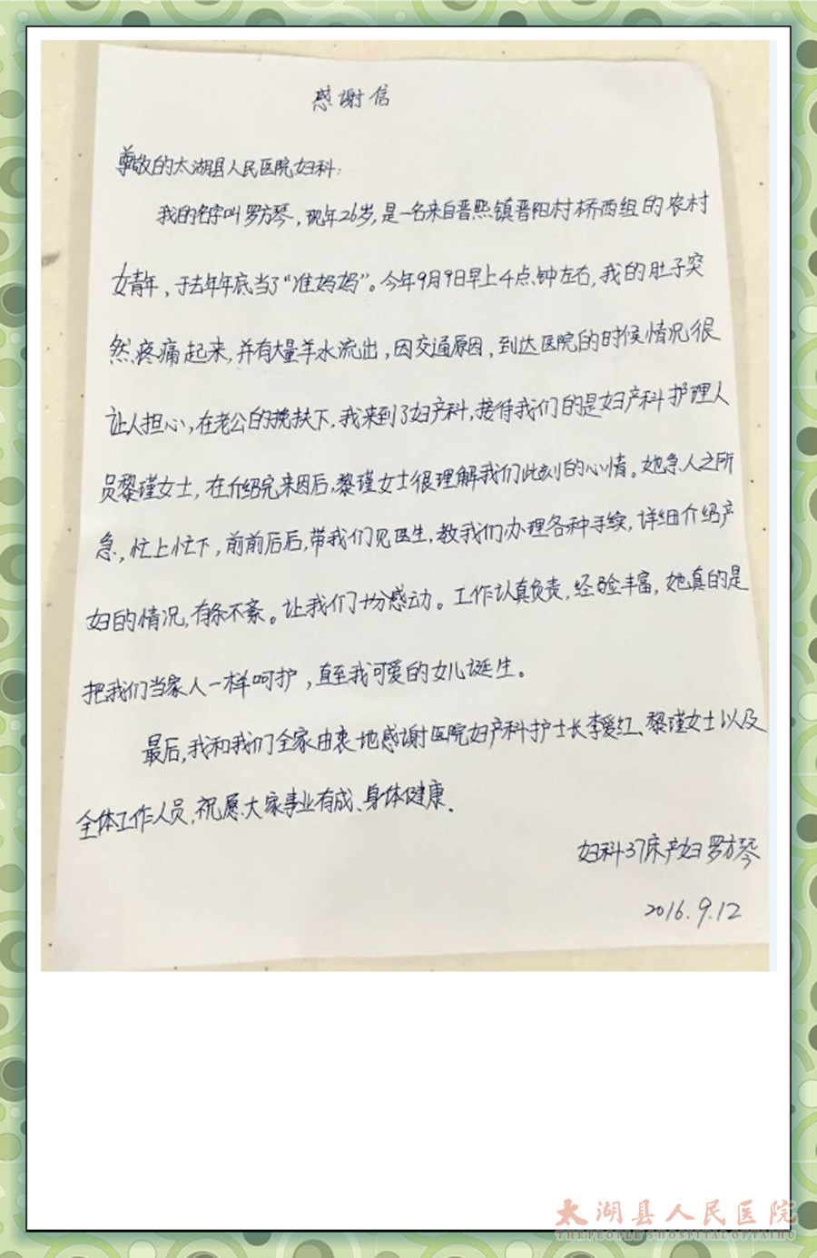 2016年9月12日,罗女士和丈夫将一封感谢信送到妇科护士站,并再三对护士长李爱红、护士黎瑾及全体医护人员的热心服务和精心护理表示感谢。