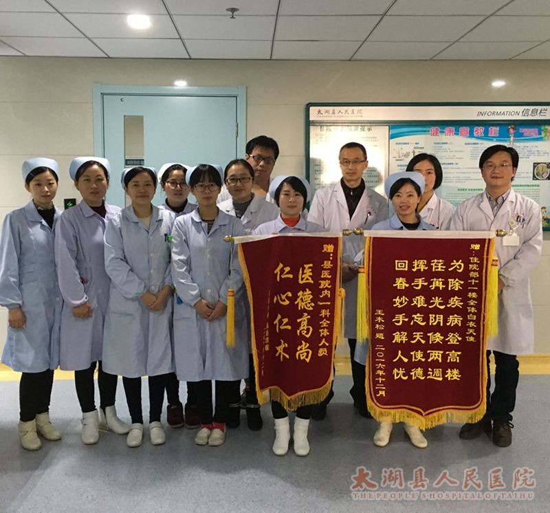 2016年12月25号,已出院的王老伯和吴老伯家属来到内一科,将两面写有“为除疾病登高楼 荏苒光阴倏俩週 挥手难忘天使德回春妙手解人优” 和“医德高尚 仁心仁术 ”的锦旗送到医护人员手中。患者家属言语诚恳,感情真挚,对内一科医护人员高尚的医德和精湛的医术满怀感激和无尽的感谢之情,对其在住院期间受到的精心治疗和热心服务,再三表示感谢。