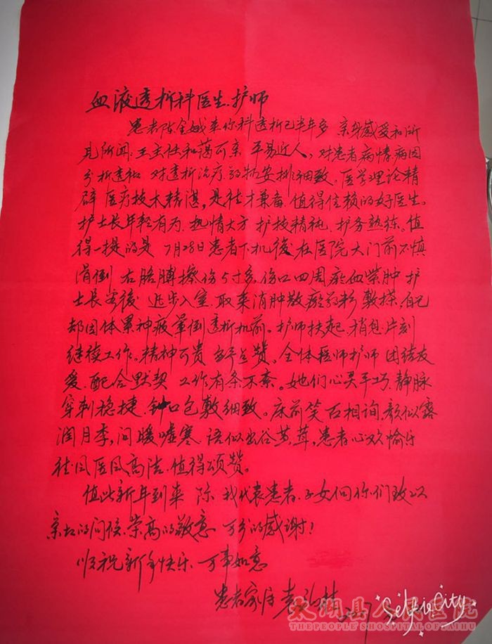 透析的半年多时间里,亲身感受和所见所闻,让患者及家属对血透室工作人员的技术、医德万分钦佩,感激之余特地送上新年的第一封感谢信。(内一科
