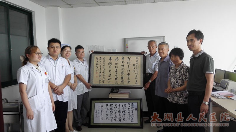 2017年7月14日,患者黄老在家人的陪同下,来到了县医院肿瘤科,将两块牌匾送到了该科徐汪松主任、江德龙、汪玲玲医师及吴艳萍护士长的手中,并真情的说道:“真心谢谢你们在我住院期间的精心照顾”, 字里行间表达着他的深深谢意和对肿瘤科全体医护人员的感激之情。