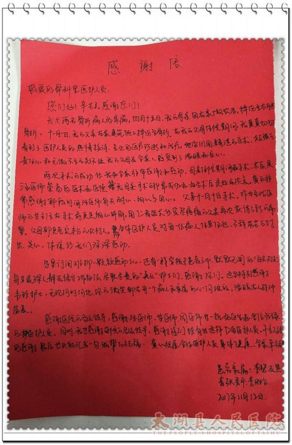 “我是两名骨折病人的家属,4月15日,我的母亲因在家做农活摔伤导致右腿骨折。11月1日,我的父亲在家建筑施工摔伤导致骨折。在我的父母住院期间,我真真切切看到了医护人员的热情接待、专业的医疗诊断和治疗,你们用精湛的医术、超强的责任心和无微不至的关怀让我的父母及全家人感受到了温暖和宽心……”