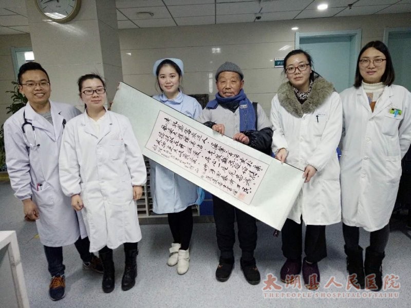 这是来自弥陀镇的詹先生在送给内二科医护人员亲自创作的一副字画中这么写道。詹先生因心悸、胸闷多次在内二科住院治疗,经倪国华、胡江玲等全体医护人员精心诊治后好转出院,现病情平稳。在住院过程中,被内二科温馨舒适的就诊环境、热情周到的服务所打动,专程送来一副自己亲笔书写的字画,表达内心的喜悦与感激之情!(内二科 赵锦霞)
