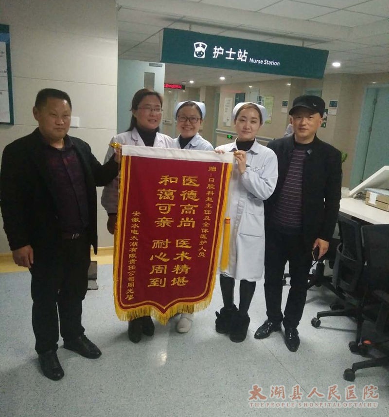近日,即将出院的周先生将一面写着:“医德高尚、医术精湛、和蔼可亲、耐心周到”的锦旗送到口腔科医护人员手中,并竖起大拇指,对他们连声称赞道:“你们都是好样的,最优秀的,服务态度也是最好的”。