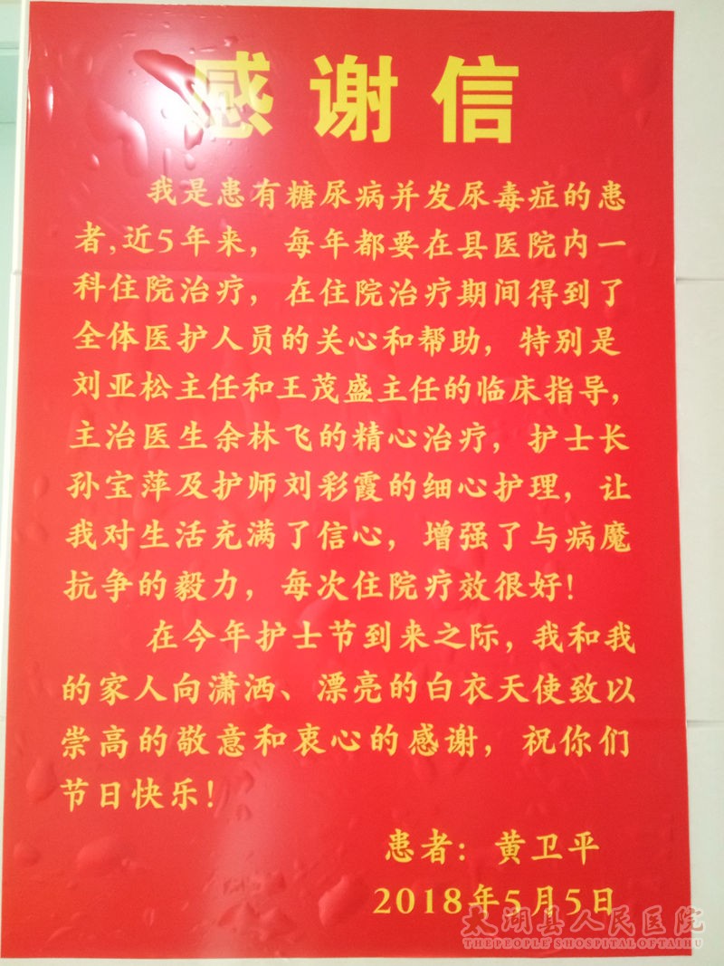 近日,我院内一科收到患者黄先生的一封感谢信。鲜红的感谢信里溢出对内一科医护人员满满的感谢之情。