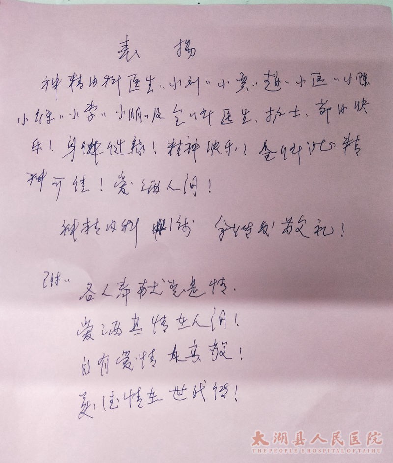 余老是一位患有脑梗死、高血压病多年的患者,也是神经内科的老病号。在常年的就医过程中,余老熟悉了神经内科的全体医护人员,和他们建立了深深的医患情感。5月3日,余老因头晕不适再次入院治疗,在责任医师韦炜、责任护士刘玲凤及全体医护人员的精心治疗和护理下,余老病情好转。为表感谢,在护士节这特殊的日子特地送来这封表扬信。(神经内科 徐琳)