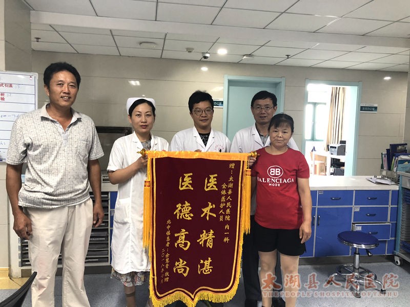 近日,透析患者余女士和她的丈夫将一面写有“医术精湛 医德高尚”的锦旗送到了内一科王茂盛主任和主治医生余林飞手中。