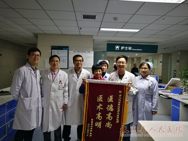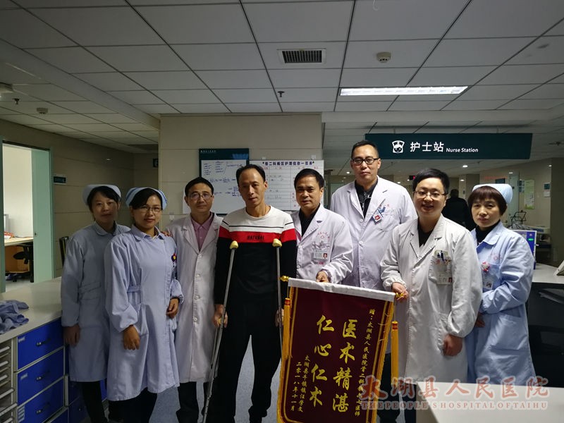 刚刚出院的患者汪先生牛镇南阳村人,10月18号因摔伤致右膝肿痛,活动受限2小时,诊断为髌骨骨折,在骨二科住院治疗,钱六七医师为患者成功实施了右髌骨骨折开放复位内固定术。术后钱医师每日细致查房,询问病情,关心术后愈合情况,指导患者正确进行功能锻炼,责任护士方瑜嘘寒问暖,对功能锻炼的每一个细节给予督促指导,确保功能锻炼有效落实。患者恢复良好,出院后为表感谢,特地送来一面锦旗。