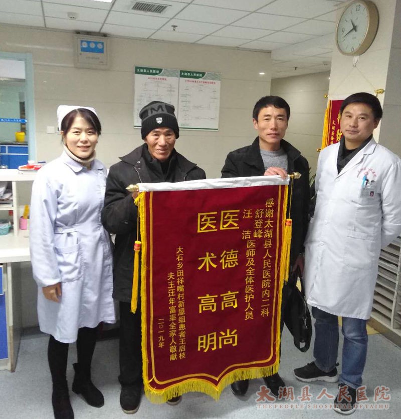 1月16日,内二科出院患者王女士的丈夫携儿子,为内二科赠送了一面绣有“医德高尚 医术高明”的鲜艳锦旗,对内二科全体医护人员的精心治疗,贴心护理表示高度赞扬和诚挚的感谢。