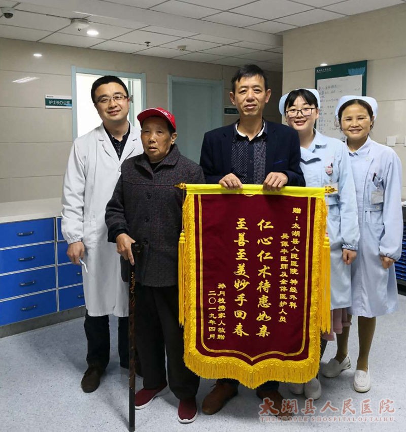 2019年4月16日上午,太湖县人民医院神经外科病房一位患者家属手捧锦旗,郑重交到吴佩丰医生手里,感谢对其母亲的救命之恩。