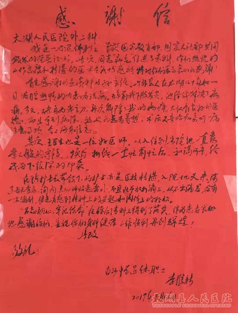 在医护人员的精心治疗和护理下,李老先生很快得以恢复出院,内心的感激之情溢于言表,对我们医护的专业水平及服务态度给予了高度肯定,并亲手写了一封感谢信送给全体医护,用他的话说“手到病除,医技精湛”。