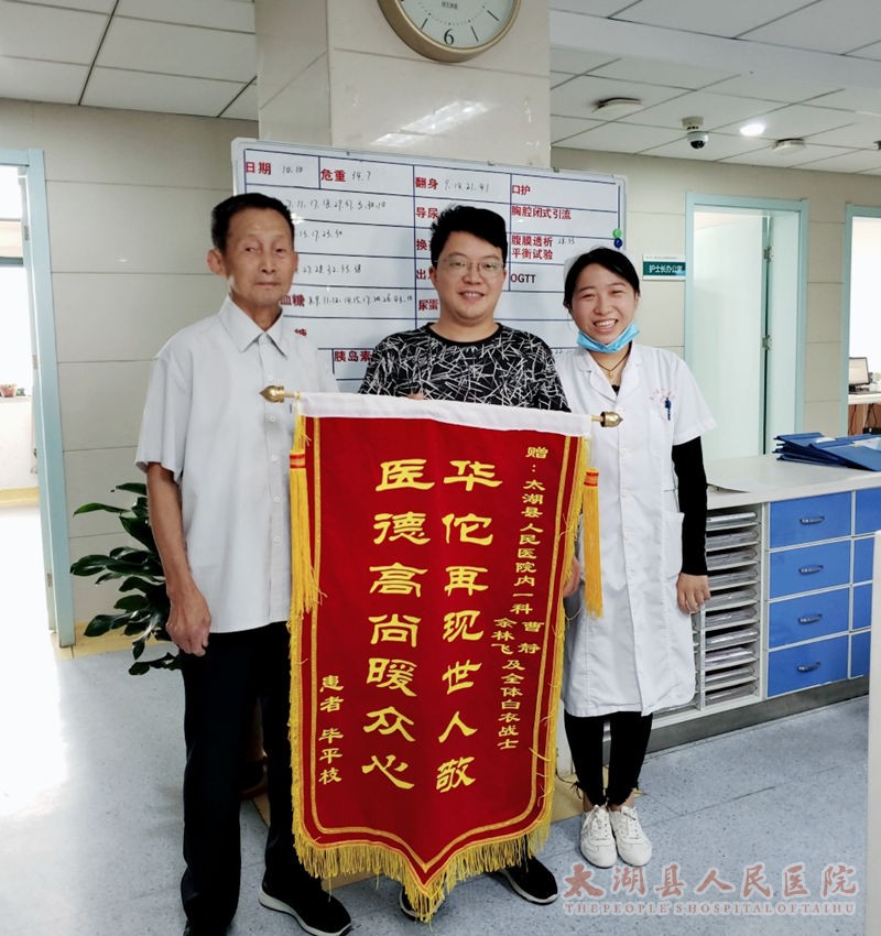 近日,一位老爷爷双手捧着一面写着“华佗再现世人敬,医德高尚暖众心”的鲜红旗帜,步履矫健的走到了内一科医护人员的面前,并且连连道谢。