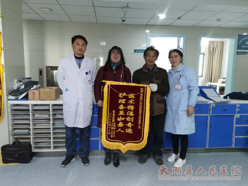 近日,我院内二科出院患者王某的子女将一面“护理备至如亲人,医术精湛创奇迹”的锦旗送至我科医护手中,以表达对我科全体医护人员的感激之情,特别感谢舒登峰主任在住院期间的精心治疗。王某因“左侧胸痛数天”入院,后确诊为冠心病、肺炎。住院后舒医生立即对其进行抗凝、扩管及消炎等治疗,患者心态很好,积极配合治疗,治疗效果十分明显,病情很快得到改善。
