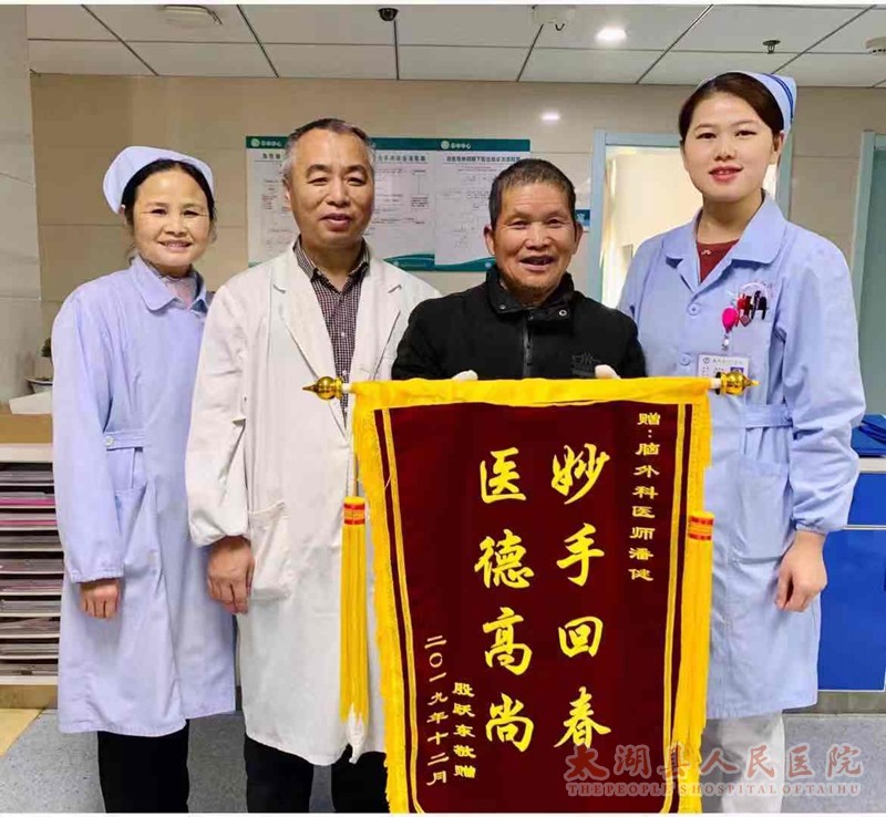 就在同一天,殷跃东爷爷在家属的陪同下冒着严寒,手捧锦旗郑重交到神经外科医务人员的手中。10月28日上午,殷爷爷在基础+局麻下行右顶钻孔血肿冲洗+引流术,术后对殷爷爷进行抗炎、止血、营养脑细胞等对症治疗。殷爷爷顽强克服病痛,积极配合治疗,医护人员细心诊查护理,在医患共同努力下,现在殷爷爷神志清楚,精神状态良好,已康复出院,特送来锦旗表示感谢。(神经外科